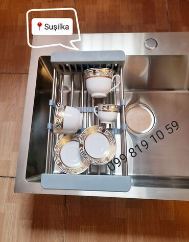 Praktik və funksional dizayn: iri kasa, sabun dispenseri və çıxarılan suşilka sayəsində qabların yuyulması və qurudulması rahatdır; polad səth asan təmizlənir və davamlıdır. Mətbəx tezgahı ilə minimalist uyğunluq yaradan modern görünüş.