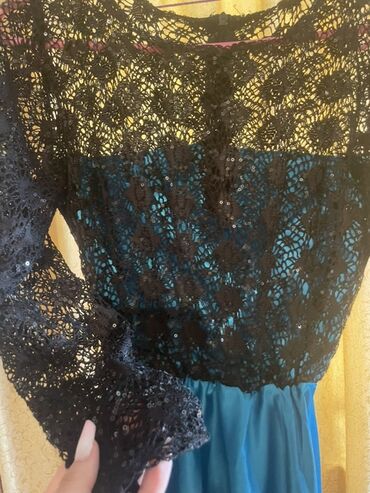 Bu ziyafət donu yuxarı hissədə qara rəngli naxışlı krujeva və sequins detalları ilə, alt hissədə isə parlaq mavi rəngli atlas parçadan hazırlanmışdır. Uzunqol dizaynı və beli vurğulayan kəsimi ilə zərif bir görünüş təmin edir. Məzuniyyət gecələri, toy və digər xüsusi tədbirlər üçün uyğundur.