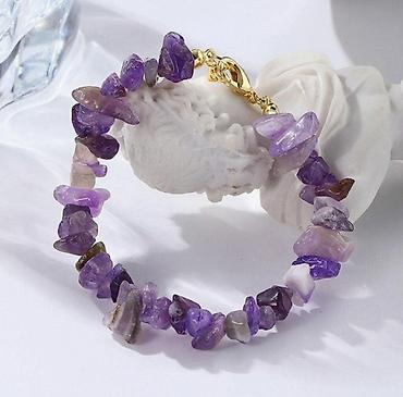 - Model 2: Ametist çiplərindən yığma qolbaq. Bənövşəyi və lavanda çalarlarında təbii daş parçaları metal (qızılı rəng) karabin bağlama ilə tamamlanır. Zərif parıltı və teksturalı görünüş təqdim edir.