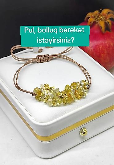 - Model 1: Sitirin (sitrin) çiplərindən yığma qolbaq. İsti qızılı-şəffaf tonlarda xırda təbii daşlar möhkəm ip üzərində makrame düyünləmə ilə formalaşdırılıb. Tənzimlənən sürüşkən bağlama sayəsində biləyə rahat oturur. Yüngül, gündəlik və ya ofis tərzi ilə uyğunlaşır.
