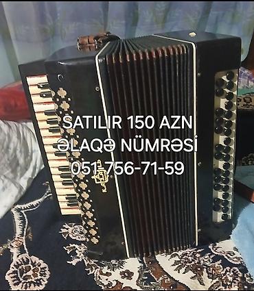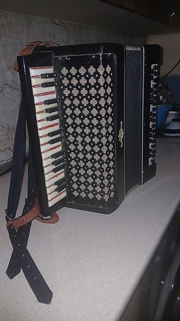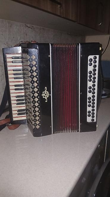 Piano-klavişli akkordeon - Korpus: zeytun-yaşıl perlamutr örtüklü, klassik görünüş. - Klaviatura: sol tərəfdə 25-ə yaxın piano tipli ağ-qara klaviş. - Bas tərəfi: sağ paneldə çoxsıralı düymə siste...