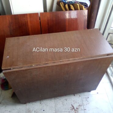 - Açılan masa: Qəhvəyi ağac rəngində, qatlanan konstruksiya. Yandan açılıb böyüyən üst panel sayəsində həm kompakt saxlanıla, həm də geniş iş/süfrə səthi əldə oluna bilər. Mətn üzərində göstərilən qiymət: 30 AZN.