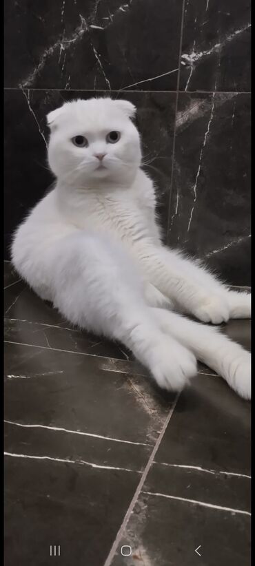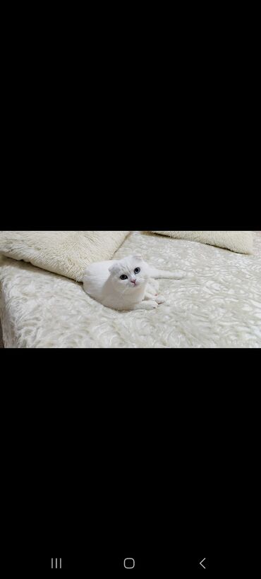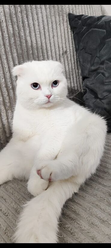 Ağ tüklü, mavi gözlü, 5aylıq qulaqları yığılmış (Scottish Fold) Xüsusiyyətlər: - Rəng: tam ağ, yumşaq və sıx tüklü örtük - Gözlər: parlaq mavi - Qulaqlar: yığılmış/qatlanmış - Xasiyyət: mehriban,o...