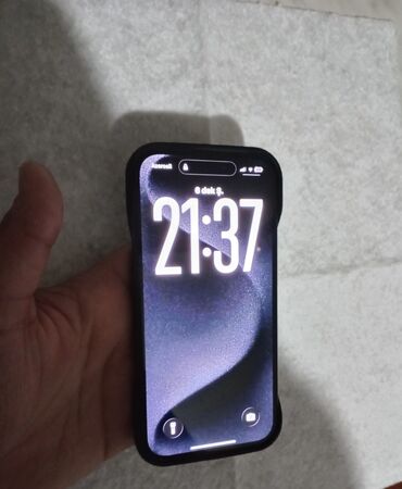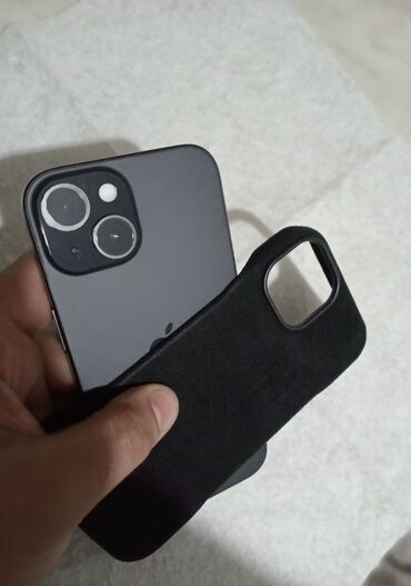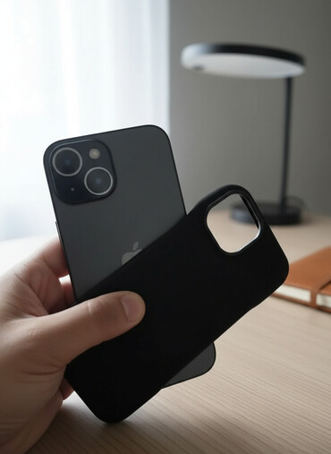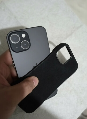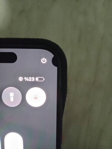 Apple iPhone (qara rəng). Dynamic Island dizaynlı ekran, ikiqat arxa kamera modulu və LED fləş. Lightning/USB‑C portu olmayan tam ekran ön panel, Face ID dəstəyi. Ekranda həssas idarəetmə paneli, batareya göstəricisi və kilid düymələri görünür. Arxa panel mat toxumalı, Apple loqolu, küncləri kəsilmiş kamera adası. Şəkillərdə uyğunlaşdırılmış qara rəngli qoruyucu keyslə birlikdə göstərilib.
