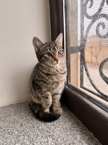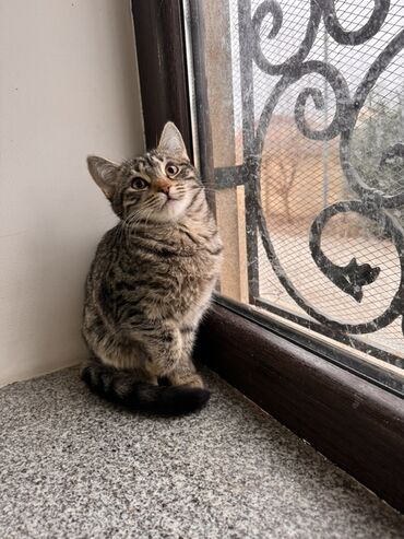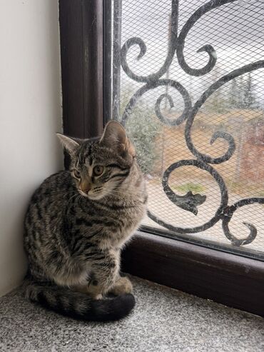 Ev pişiyi – balaca - Növ: Qısa tüklü təkir (boz-qara zolaqlı) - Təxmini yaş: 1ay yarım - Rəng/naxış: kürəyində və pəncələrində tünd zolaqlar, sinədə açıq ton - Xüsusiyyətlər: çox mehriban, oyna...