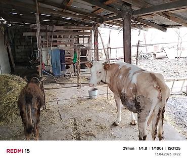 Südlük inək – buzovu ilə birlikdə - Cins: yerli qarışıq (şabalıdı rəng). - Buzov yanındadır, ana südü ilə bəslənir (şəkildə görünür). - Yeyim: otlaqda sərbəst otarılır, qaba yemə öyrəşib. - Sakit ...