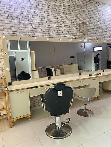 - Vizaj və saç üçün iş stolu: uzun səth, hər bölmədə dartmalı çekmecələr, yan tərəflərdə şkaf bölmələri, üst hissədə geniş divar güzgüsü boydan‑boya yerləşdirilib. Güzgünün perimetri boyunca işıq lampaları üçün yuvalar var, elektrik rozetkaları masanın üzərindədir.