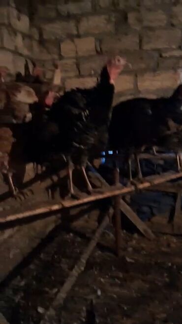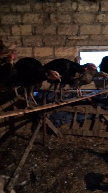 Satış üçün hinduşka sürüsü - Növ: Qara rəngli, naxışlı lələklərə malik ev hinduşkaları (erkək və dişi fərdlər görünür) - Say: Şəkillərdə 6-7 baş - Rəng və görünüş: Tünd qara-qəhvəyi lələklər, mavi...