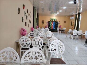 - Oturacaqlar: dekorativ naxışlı ağ stullar və mərmər effekti masaüstləri ilə çoxsaylı masa dəsti