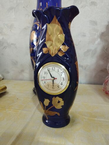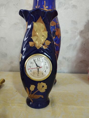 Mavi keramik vazalı masa saatı - Material: parlaq keramik/kobalt mavi şir. - Dizayn: qızılı bitki və çiçək naxışları, dalğalı kənarlı dekorativ vaza gövdəsi. - Funksiya: ön hissəyə inteqrə olunmuş...