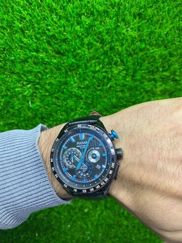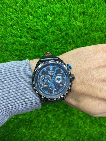 - Siferblat: çox laylı idman üslubunda, kontrast mavi əllər, fosforlu indekslər
