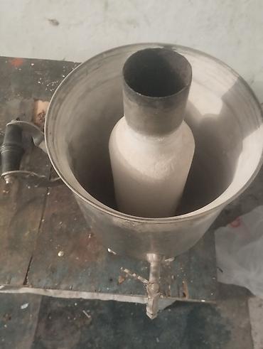Metaldan hazırlanmış odun/kömürlə işləyən samovar tipli suqızdırıcı (peç su qızdıranı). Xüsusiyyətlər: - Material: qalın divarlı metal gövdə - Gövdə forması: oval üst qapaqlı şaquli korpus - Yanac...
