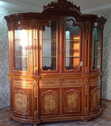 - Material: təbii ağac əsaslı korpus, dekorativ oyma elementlər; ön fasadda şpon/naxışlı panellər