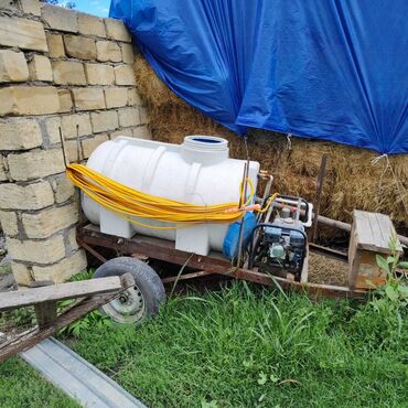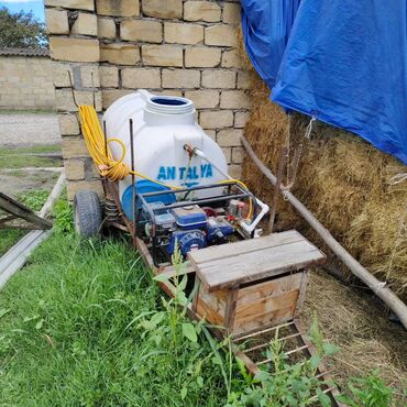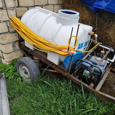 Benzin mühərrikli bağ-bitki çiləmə aparatı - Daşıma arabası üzərində qurulu, iri həcmli plastik su çəni (təxminən 200 L yazısı görünür) - Dördtaktlı benzin mühərriki ilə işləyən yüksək təzyiqli na...