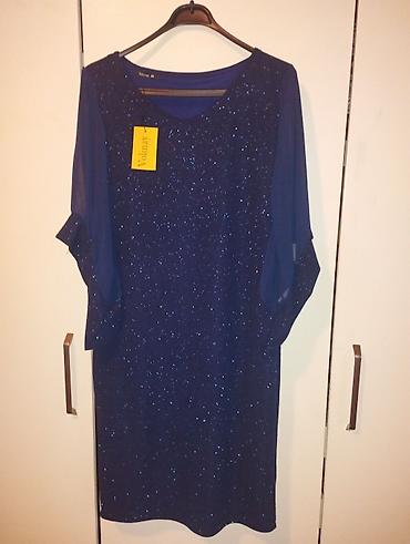 - Məhsul: Qadın geyimi – dizə yaxın uzunluqda, qolsuz don - Rəng və naxış: Parlaq kobalt-mavi fon üzərində bənövşəyi, gümüşü və qara abstrakt fırça izləri - Dizayn: Dərin V-yaxa, ön hissədə mərkəz ...