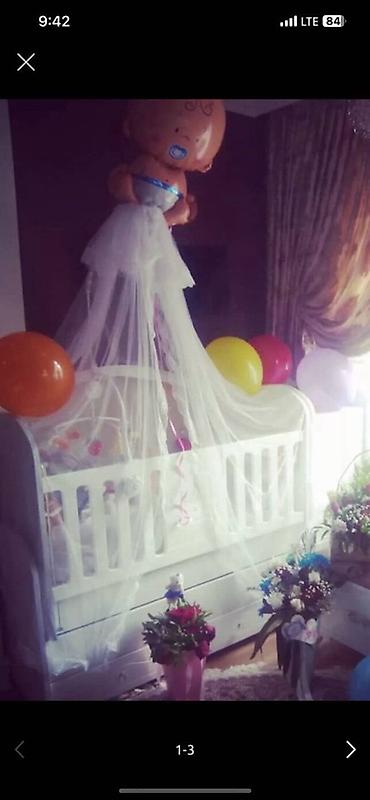- Aşağı hissəsində geniş çekmecələri olan ağ rəngli beşik/uşaq çarpayısı. Yan qoruyucu barmaqlıqlar, üst hissədə tül pərdə (sineklik) üçün dayaqlar. Dekor üçün şarlar və fiqurlu balon görünür.