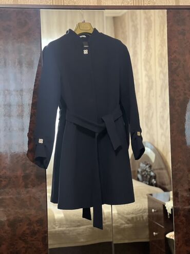 Ölçü. 46 Qadın palto – tünd göy rəng - Klassik düz kəsim, dizdən bir qədər uzun - Yumşaq, isti parça; qalın foder - Yaxasında və qol uclarında eyni rəngdə süni kürk detalları - Ön hissədə iri, de...