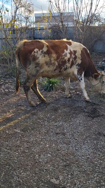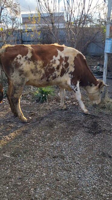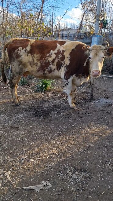Satılır: inək 3aylığ erkək balası var - Cins: simental (şəkildə göründüyü kimi, qəhvəyi rəng, alnı açıq rəngli) - Buynuzlu, sakit xasiyyətli, otlaqda rahat güdülür - Sağım üçün münasib, süd və bu...