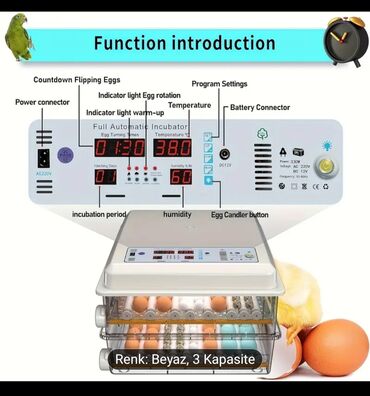 - Rəqəmsal idarəetmə paneli: temperatur, rütubət, inkubasiya günləri və yumurta çevirmə vaxtının ekranı; proqram səviyyəsində parametrlərin tənzimlənməsi.