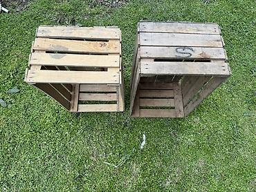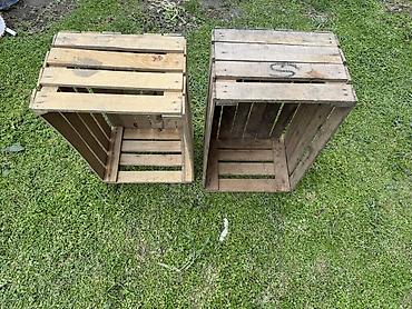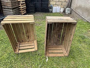 Şəkillərdə iki ədəd eyni tip taxta sandıq göstərilir. Rustik üslub sevənlər və praktik saxlama həlləri axtaranlar üçün ideal.