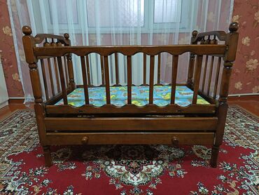 Taxta uşaq beşiyi - Material: möhkəm taxta karkas, şaquli barmaqlıqlar - Ölçü: yeni doğulmuşdan körpə yaşına qədər rahat (foto üzrə standart beşik ölçüsü) - Hərəkətlilik: 4 ədəd təkər (döndürülə b...