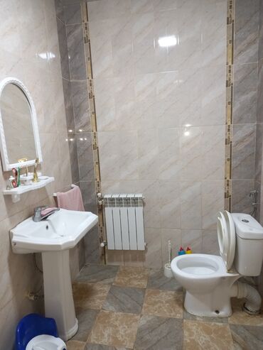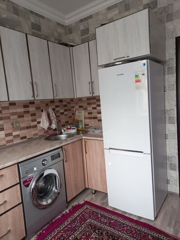 - Mətbəx: L formalı mebel dəsti, üst-alt şkaflar, mermer tipli masaüstü, LG paltaryuyan, Samsung iki kameralı soyuducu, paslanmayan poladdan dəyirmi lavabo, divar boyu keramika kafel/metro tipli panellər.