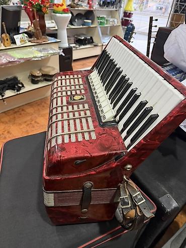 Təsvir: - Düyməli və klavişli kombinasiyalı akkordeon (sol tərəfdə pianino klavişləri, sağ tərəfdə düymələr) - Qara korpus, dekorativ naxışlı səslik panelləri - Qırmızı-bağırsaqlı məxmər rəngli məx...