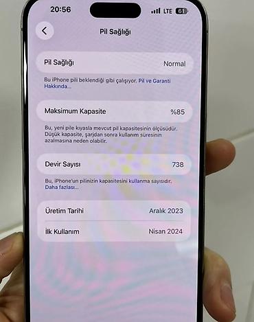 - Batareya məlumatı (ekrandan): Pil Sağlığı – Normal; Maksimum Kapasite – 85%; Devir Sayısı – 738; Üretim Tarihi – Aralık 2023; İlk Kullanım – Nisan 2024