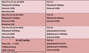 • Start Pro 15 – 21.90 AZN: ölkədaxili 1250 dəq, 15 GB internet, rouminq 1 GB