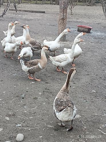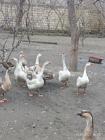 Məhsul: Qazlar - Cins: ehtimalən Linda tipli iri ətlik qazlar (ağ və boz rəngli fərdlər görünür) - Cinsiyyət: əsasən erkəklər - Rənglər: tam ağ, boz-ağ qarışıq - İstiqamət: ətlik və damazlıq üçün ...