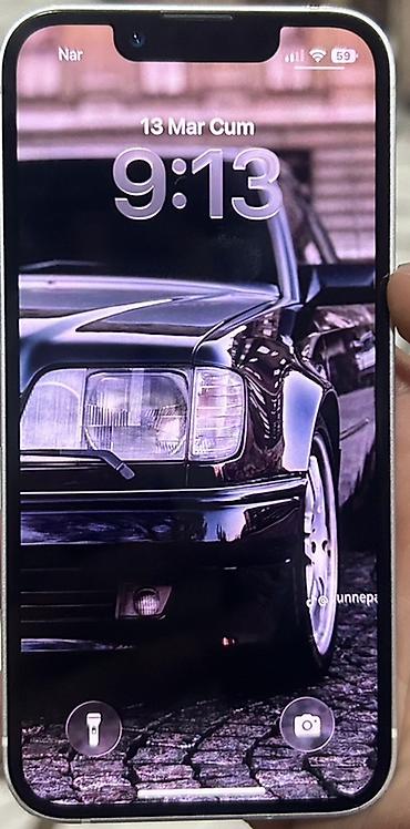 - Model: iPhone 13 (şəkildəki dizayn – iki diaqonal yerləşən arxa kamera, düz kənarlar və ağ arxa panel)
