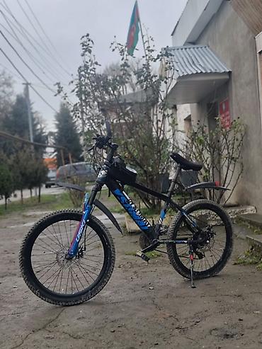 Mavi və qara rənglərdə olan bu dağ velosipedi möhkəm çərçivəyə və ön
