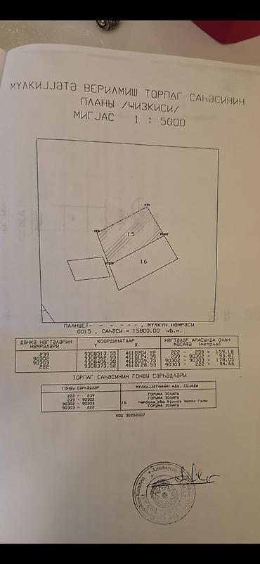 - Sənəd: mülkiyyətə verilmiş torpaq sahəsinin plan-çizgisi (miqyas 1:5000) mövcuddur; koordinatlar və sərhədlər sxemdə göstərilib, rəsmi möhürlü