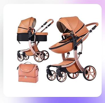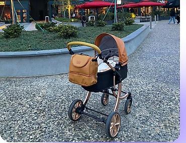 - Şəkildə gördüyünüz kimi tam komplekt: ana çantası, beşik tipli uzanma bloku və gəzinti oturacağı ilə.