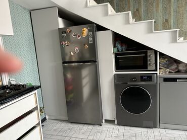 - Texnika yerləşimi: pilləkənaltı nişdə çoxfunksiyalı zona – inox iki qapılı LG soyuducu, ayrıca nişdə elektrik sobası, ön yükləməli paltaryuyan qurğu, yanaşı qabyuyan maşın üçün bölmə.
