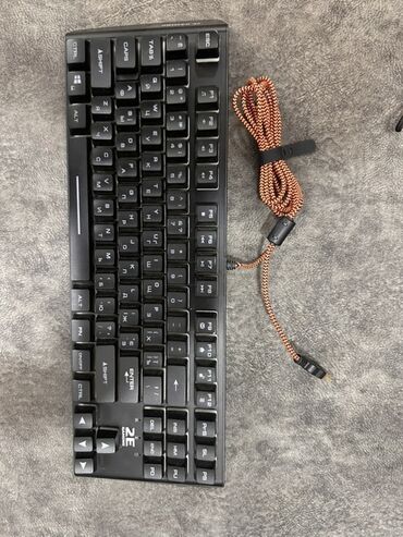 - 2E brendli kompakt ölçülü (TKL) mexaniki klaviatura. Qara korpus, yüksək profilli düymələr, İngilis və Kiril işarələnməsi. USB qoşulma, toxumalı narıncı-qarışıq örgülü kabel və ferrit filtrli müdaxilə qoruması.