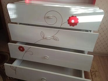 - 4 geniş çekmece: hər birinin üzərində naxışlı sarmaşıq və qırmızı çiçək printi, yumru tutacaqlar