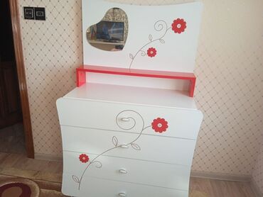 Divara bərkidilən bu dəst ağ rəngdə iki siyirməli komod və dairəvi güzgüdən ibarətdir. Komodlar qızılı rəngli tutacaqlarla təchiz olunub. Güzgü çəhrayı çiçəklərlə bəzədilib. Bu mebel dəsti yataq ot...