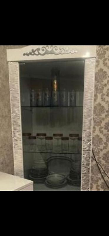 - Vitrin şkafı: Şüşə qapılı, iki mərtəbəli şüşə rəflərlə. Üstdə və yanlarda klassik dekor elementləri, ağ korpus və tekstural çərçivə. Qədəh, qab-qacaq və bəzək əşyalarının nümayişi üçün uyğundur.