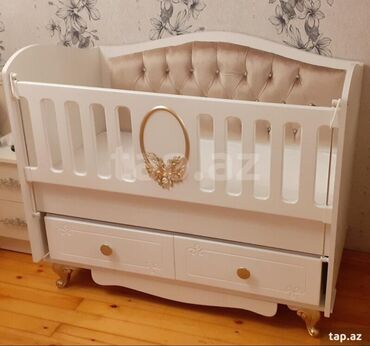 Ağ rəngdə taxta uşaq çarpayısı satılır. Çarpayının baş hissəsində bej rəngli, düymələrlə bəzədilmiş yumşaq üzlük var. Ön tərəfində qızılı rəngli, oval formalı bəzək elementi yerləşir. Çarpayının altında iki geniş siyirmə var ki, bu da uşaq əşyalarını saxlamaq üçün əlavə yer təmin edir. Dörd qızılı rəngli ayağı sayəsində asanlıqla hərəkət etdirilə bilər. Rahat və funksional dizaynı ilə uşaq otağına zərif bir görünüş verir. 250 manata Sədərəkdən alınıb. İstifadə olunmayıb. Endirim olunacaq.
