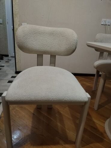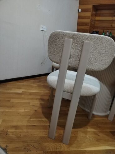 - Stullar: 6 ədəd, yumru oturacaq və yastı, ovala yaxın bel hissə; iki sütunlu arxa dayaqları ilə dekorativ görünüş; yumşaq teksturalı parça üzlük, açıq krem/ağ çalar