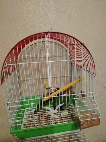 - Qəfəs: Ağ-metal barmaqlı, qırmızı tağlı üst hissə və yaşıl alt qablı asma qəfəs.