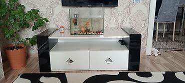 - Saxlama üçün mebel: ağ və qara rəngdə TV-altlığı/komod tipli stend; üst platforma akvaryum üçün stabil səthdir, ortada geniş açıq rəf, aşağıda iki qapalı bölmə (xromlaşdırılmış romb formalı tutacaqlar).