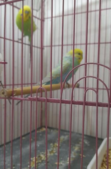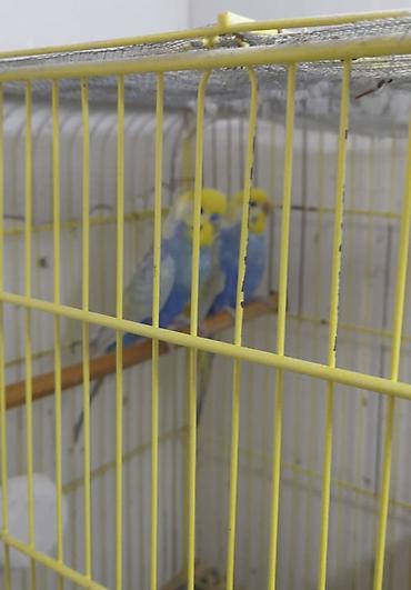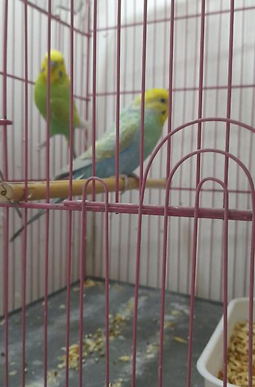 Nömrəli qəfəzdə iki dalğıç papağan (büdcəri) cütü. Xüsusiyyətlər: - Rənglər: biri tam sarı (lutino), digəri yaşıl-sarı, qara zolaqlı baş naxışları və mavi gaga üstü. - Növ: budgerigar (undulat). -...