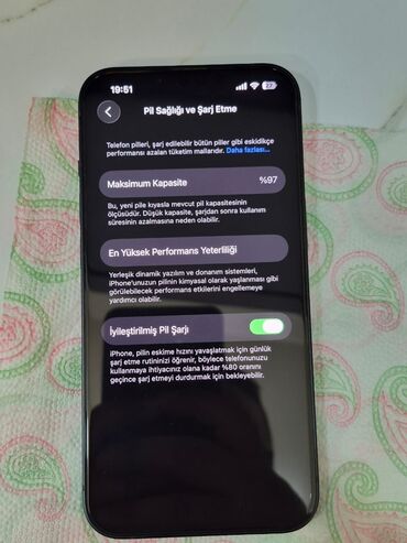 Apple iPhone 15 Pil: 88% dir Xüsusiyyətlər: - Rəng: Qara - Ekran: tam ekran OLED, Dynamic Island kəsiyi - Qutu: orijinal qutusu var - Arxa korpus mat örtüklüdür Üzərində 3 kaubra ve Adapteri verili...