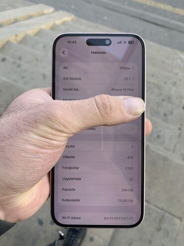 Məhsul: iPhone 15 Plus, 128 GB Xüsusiyyətlər: - Rəng: Ağ - Ekran: Böyük ölçülü Super Retina XDR, Dynamic Island kəsiyi - Kamera: İkiqat arxa kamera modulu + LED flaş - iOS versiyası: 18.7.1 - Yadd...