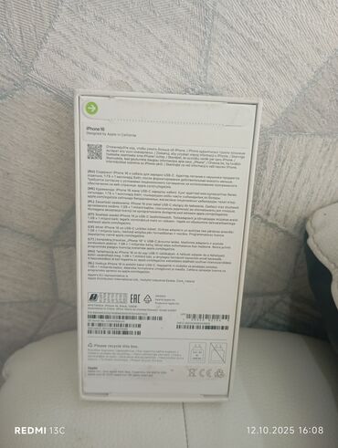 Apple iPhone 16 – 128 GB, mavi rəng Qutunun üzərindəki məlumatlar: - Model: iPhone 16 (A3287) - Yaddaş: 128 GB - Rəng: Açıq mavi - Dizayn: Apple tərəfindən Kaliforniyada dizayn edilib - İstehsal: ...