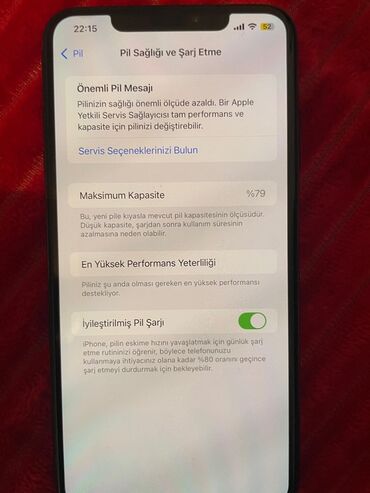 - Batareya: Pil sağlamlığı bölməsində maksimum tutum 79% göstərilir; “İyileştirilmiş Pil Şarjı” aktivdir