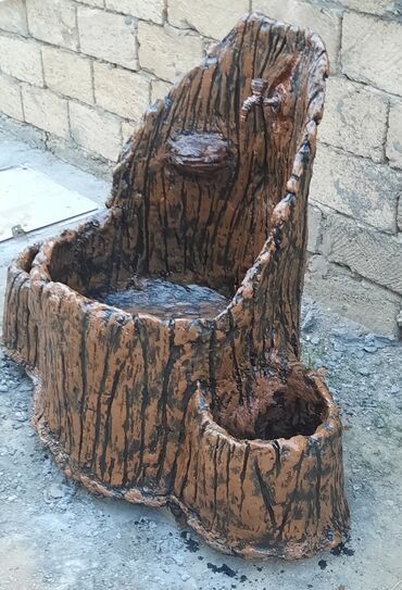 - Tərkib: Betondan/formabetondan hazırlanmış, əl işidir; səthi ağac qabığı teksturası ilə boyanıb və laklanıb.