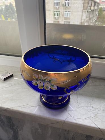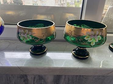 Kəsimli büllur ayaqlı meyvə/qənnadı qabı 2 Edetdir. - Material: qalın kəsimli büllur - Dizayn: şəffaf büllur üzərində qızılı zolaqlar və relyef kəsim naxışları; panellərdə əl işinə bənzər ağ-yaşıl...
